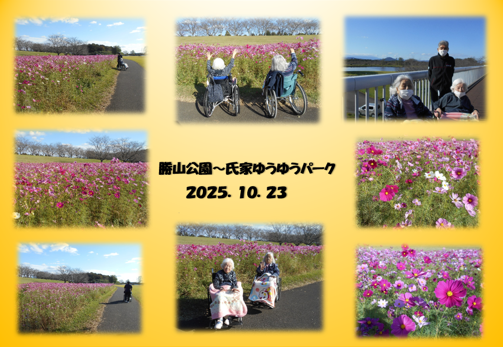 勝山公園にできた橋を渡った先にコスモスが見え、ご入居者様からも「きれいだね。」